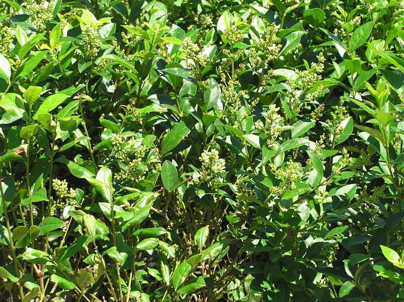 with heavy-scented, dull white flowers and shiny black fruit. |