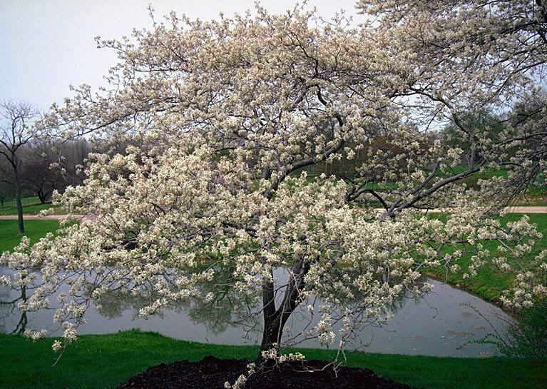 spring. Yellow fall color. Use as a specimen. Somewhat drought & salt - tolerant. |
